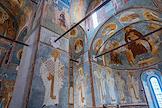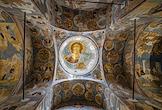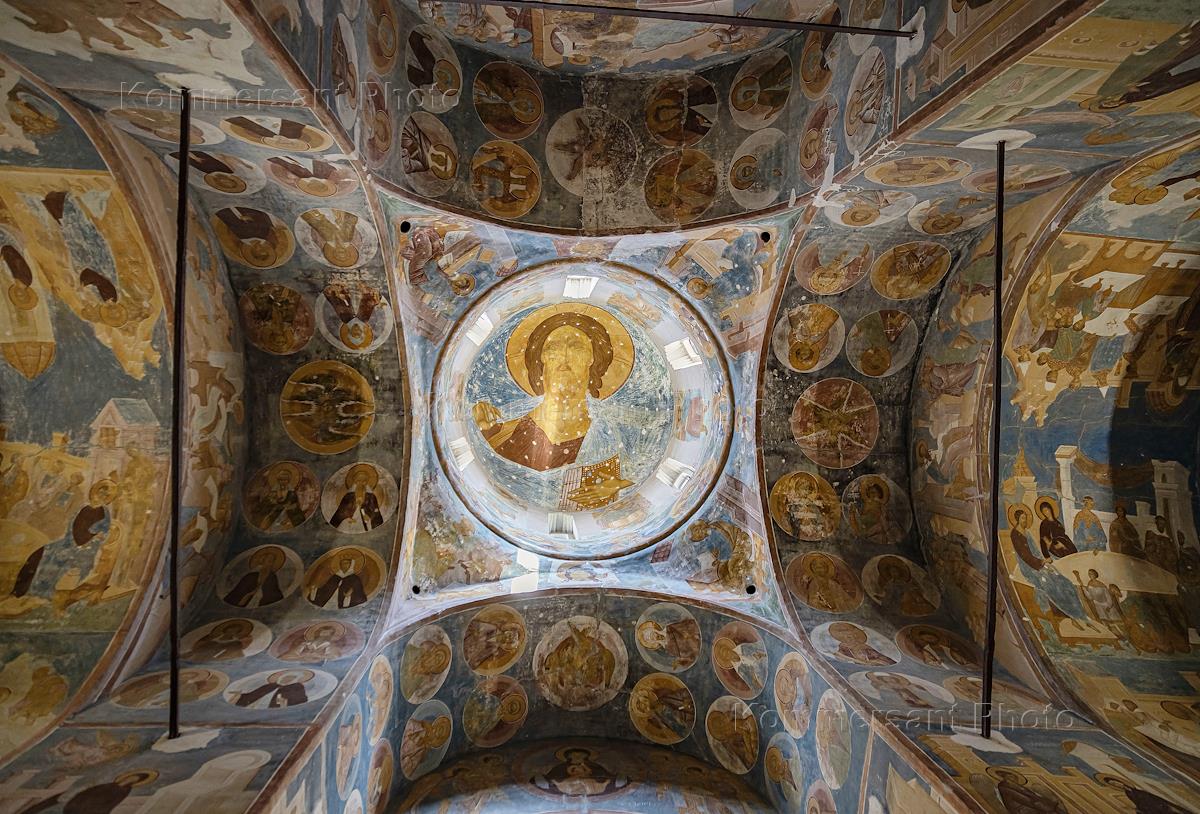 Мужской Ферапонтов Белозерский Богородице-Рождественский монастырь Вологодской епархии Русской православной церкви. Жанровая фотография. Фреска древнерусского иконописца Дионисия на куполе храма.