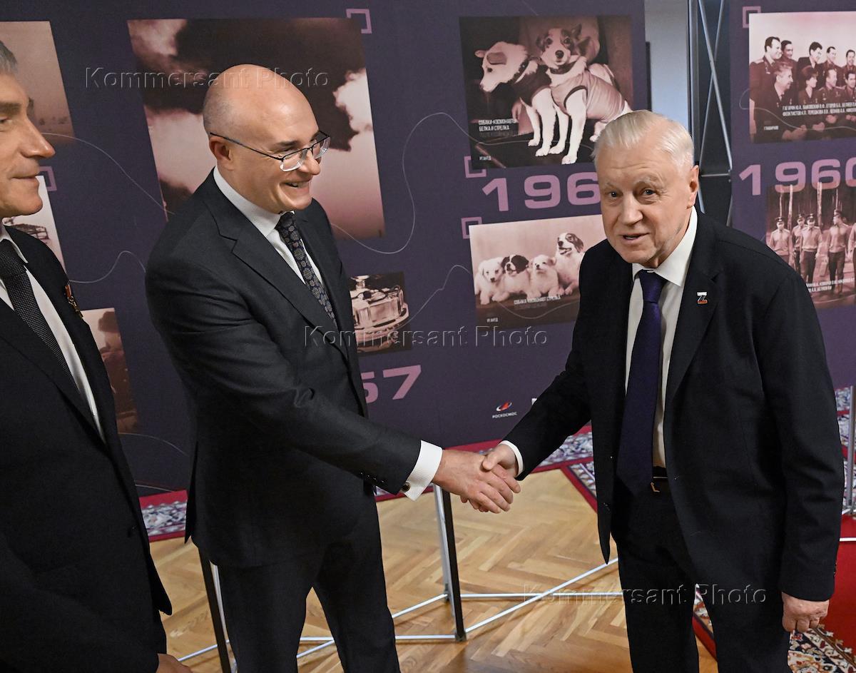 Церемония открытия выставки "Легенды космоса", посвященной 70-летию космодрома Байконур и 65-летию Центра подготовки космонавтов имени Ю.А. Гагарина, в Государственной думе (ГД) России. Слева направо: член комитета ГД России по транспорту и развитию транспортной инфраструктуры Роман Романенко, председатель комитета ГД России по экономической политике Максим Топилин и председатель партии "Справедливая Россия – За Правду", руководитель фракции "Справедливая Россия – За Правду" в ГД России Сергей Миронов во время церемонии.