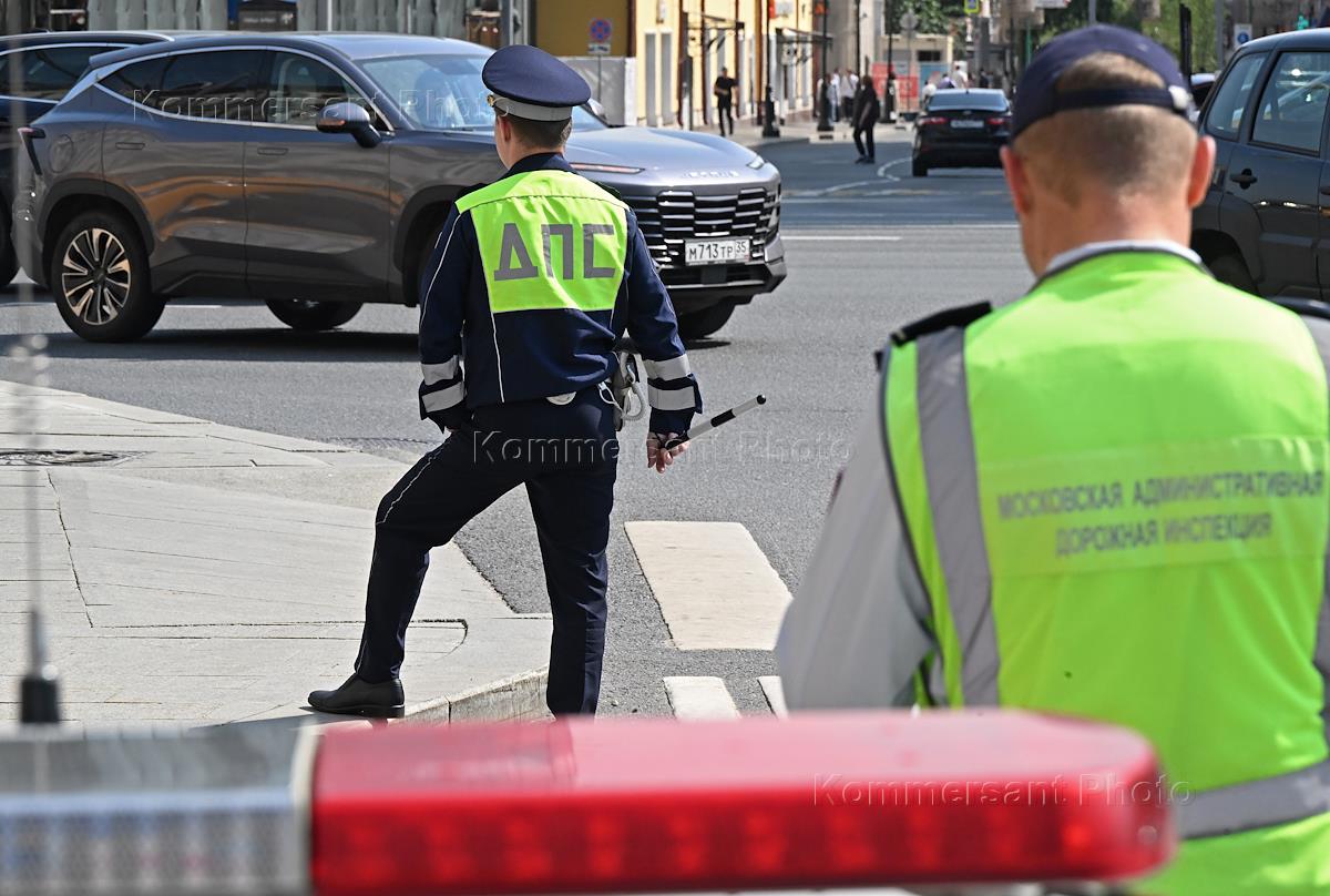 Enforcement raid targeting taxi drivers operating without proper certification in violation of Article 10.14 of Moscow's Administrative Code. Genre photography. Road Patrol Service officers during a raid on Smolenskaya Square.