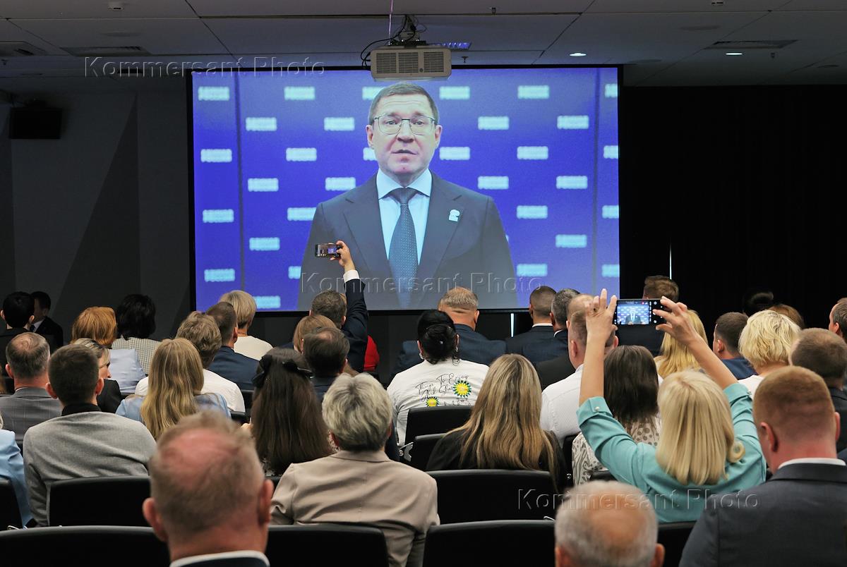 43-я конференция Свердловского регионального отделения партии "Единая Россия" в конгресс-холле "Екатеринбург-Экспо". Первый заместитель председателя Совета Федерации России, секретарь Генерального совета партии "Единая Россия" Владимир Якушев (на экране) во время конференции.