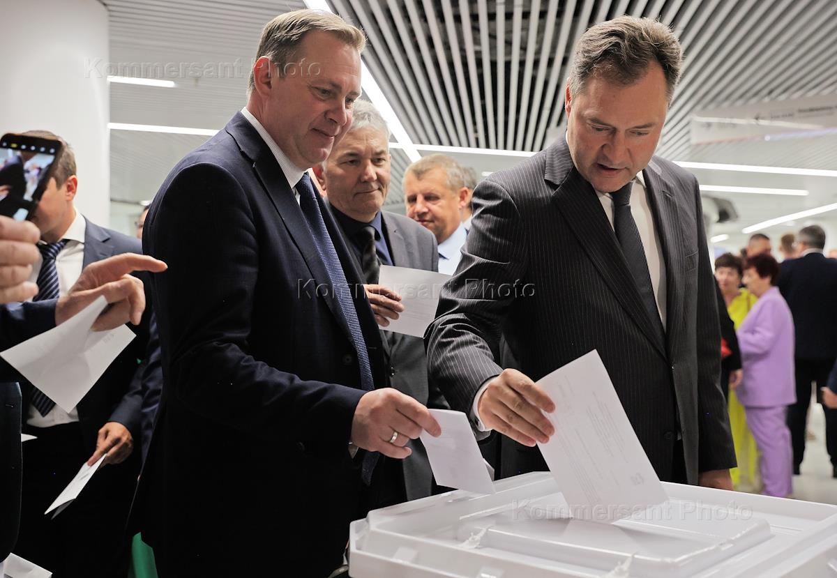 43-я конференция Свердловского регионального отделения партии "Единая Россия" в конгресс-холле "Екатеринбург-Экспо". Заместитель председателя комитета по социальной политике Законодательного собрания (ЗакС) Свердловской области Александр Серебренников (справа) во время тайного голосования.