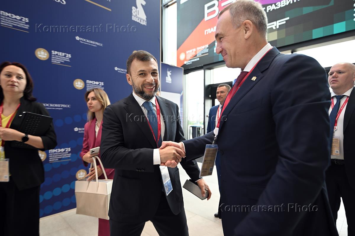 The XXVIII St. Petersburg International Economic Forum (SPIEF) 2025 at the ExpoForum Convention and Exhibition Centre. Head of the Donetsk People's Republic (DPR) Denis Pushilin (centre) and Governor of the Khanty-Mansiysk Autonomous Okrug - Yugra Ruslan Kukharuk (right) at the forum.