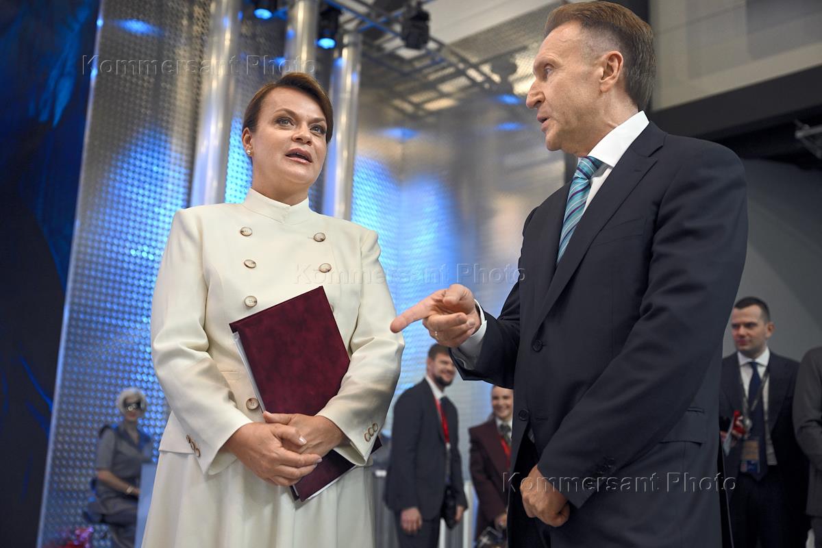 The XXVIII St. Petersburg International Economic Forum (SPIEF) 2025 at the ExpoForum Convention and Exhibition Centre. Deputy Minister of Defence of the Russian Federation, Chairperson of the Defenders of the Fatherland Foundation Anna Tsivileva (left) and Chairman of the State Development Corporation VEB.RF Igor Shuvalov (right) at the forum.