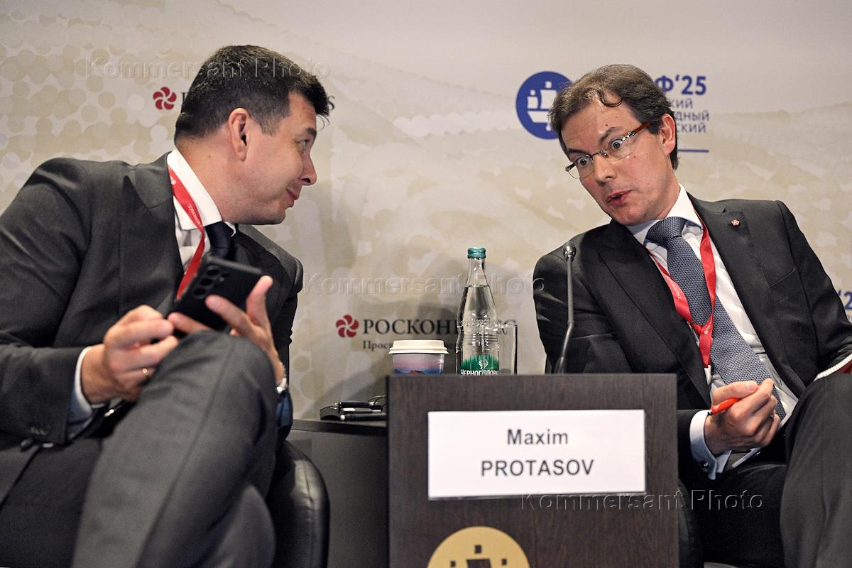 XXVIII St. Petersburg International Economic Forum (SPIEF) 2025 at the ExpoForum Convention and Exhibition Centre. Session: "Everything flows, everything changes: new consumption trends and the development of the local beauty industry in Russia". Deputy Minister of Industry and Trade of Russia Mikhail Yurin (left) and head of the ANO "Russian Quality System" (Roskachestvo) Maxim Protasov at the session.