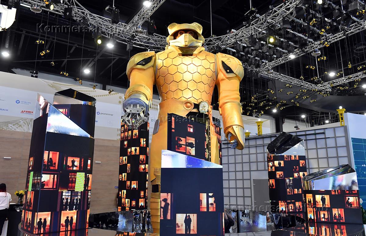 XXVIII St. Petersburg International Economic Forum (SPIEF) 2025 at the Expoforum Convention and Exhibition Center. A robot bee figure at the Bashkortostan stand.