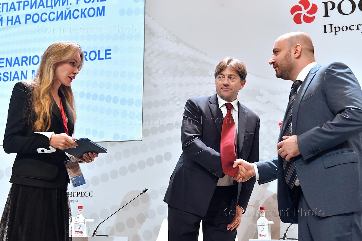 The XXVIII St. Petersburg International Economic Forum (SPIEF) 2025 at the ExpoForum Convention and Exhibition Centre. Session "Scenarios of Technological Repatriation: the Role and Place of Foreign Companies in the Russian Market". From right to left: Governor of the Samara Region Vyacheslav Fedorishchev, CEO of Packaging Systems JSC Aleksandr Krivolapov and CEO of ANO Innovative Engineering Centre Nikolay Kolpakov after the session.