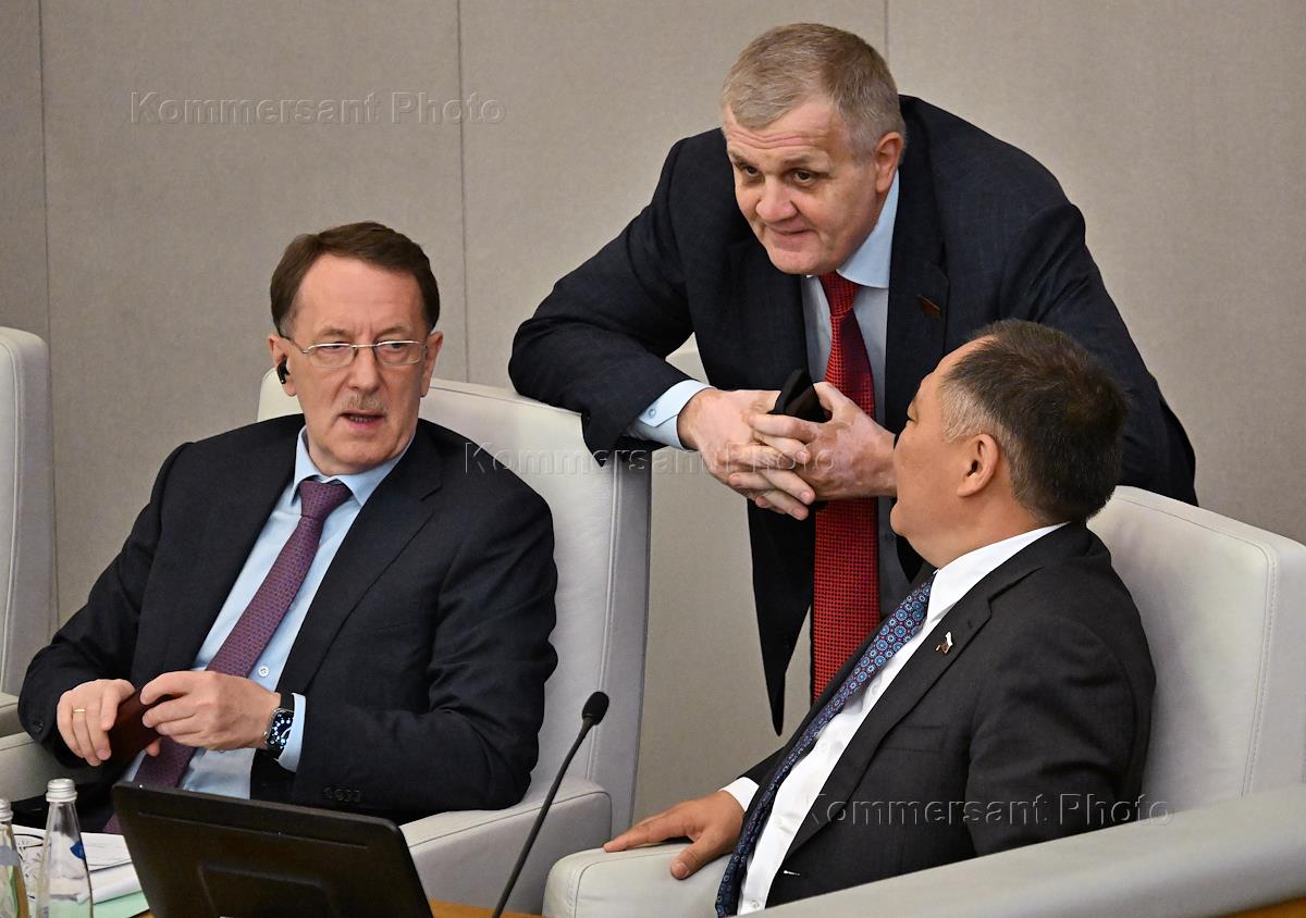 Plenary session of the State Duma of Russia. From left to right: member of the State Duma Committee on Budget and Taxes Viktor Seliverstov, member of the State Duma Committee on Agrarian Issues Alexey Lavrinenko and member of the State Duma Committee on Security and Anti-Corruption Adalbi Shkhagoshev during the session.