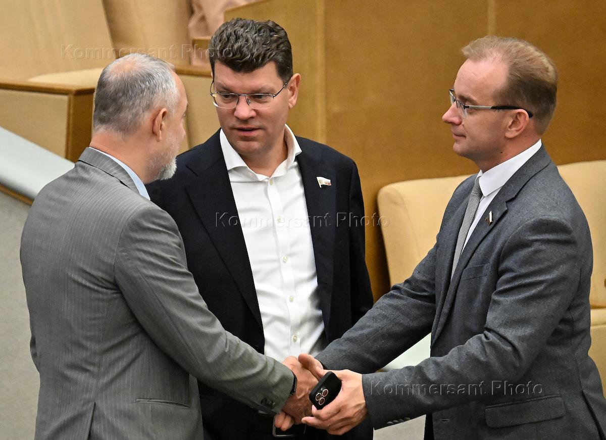 Пленарное заседание Государственной думы (ГД) России. Член комитета ГД России по промышленности и торговле Владимир Павлов (слева) и первый заместитель председателя комитета ГД России по экономической политике Денис Кравченко (в центре) во время заседания.