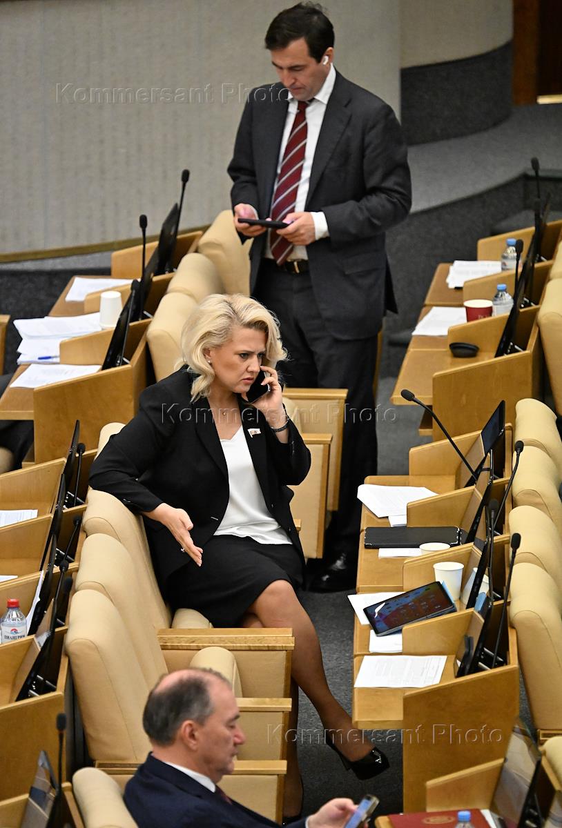 Пленарное заседание Государственной думы (ГД) России. Заместитель председателя комитета ГД России по защите семьи, вопросам отцовства, материнства и детства Мария Дробот (слева) во время заседания.