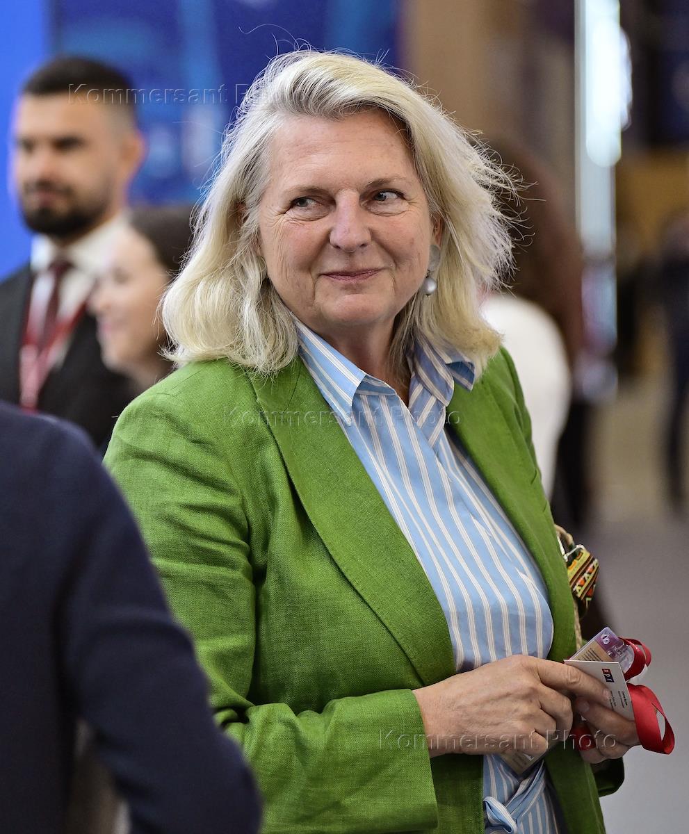 XXVIII Петербургский международный экономический форум (ПМЭФ) 2025 в конгрессно-выставочном центре "Экспофорум". Руководитель центра G.O.R.K.I (The Геополитическая обсерватория по ключевым проблемам России), бывший министр иностранных дел Австрии Карин Кнайсль на форуме.