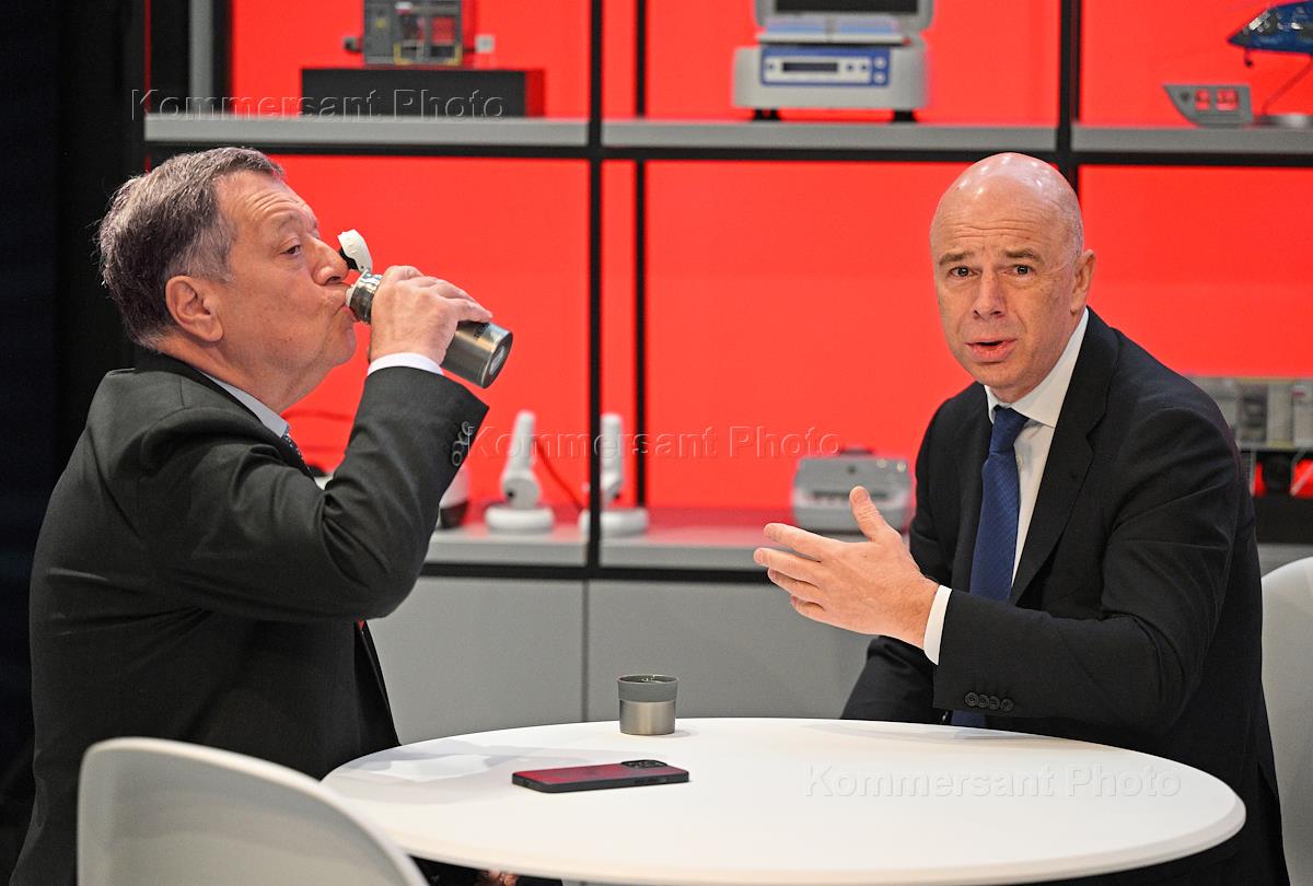 The XXVIII St. Petersburg International Economic Forum (SPIEF) 2025 at the ExpoForum Convention and Exhibition Centre. Russian Finance Minister Anton Siluanov (right) and Chairman of the State Duma Committee on Budget and Taxes Andrei Makarov (left) during the forum.