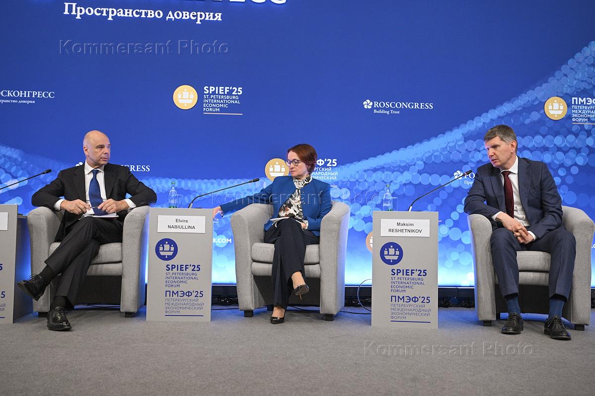 XXVIII Петербургский международный экономический форум (ПМЭФ) 2025 в конгрессно-выставочном центре "Экспофорум". Сессия "Экономика предложения – стратегия роста в условиях современных вызовов". Слева направо: министр финансов России Антон Силуанов, председатель Центрального Банка России Эльвира Набиуллина и министр экономического развития России Максим Решетников во время сессии.