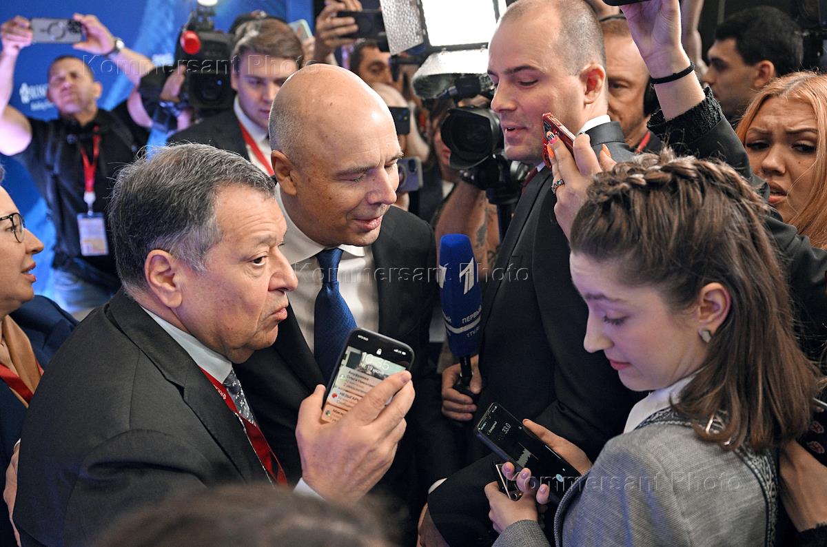 XXVIII Петербургский международный экономический форум (ПМЭФ) 2025 в конгрессно-выставочном центре "Экспофорум". Министр финансов России Антон Силуанов (в центре) и председатель комитета Государственной думы России по бюджету и налогам Андрей Макаров (слева) во время форума.