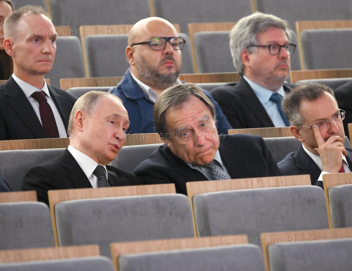 XXVIII St. Petersburg International Economic Forum (SPIEF) 2025. Working visit of Russian President Vladimir Putin to St. Petersburg. Visit to the restored historic building of the Rimsky-Korsakov St. Petersburg State Conservatory. From left to right: Deputy Prime Minister of Russia Marat Khusnullin, Russian President Vladimir Putin, Artistic Director of the St. Petersburg House of Music Sergei Roldugin and Aide to the President of Russia Vladimir Medinsky during a concert performed by students and teachers of the conservatory in the Rubinstein Great Hall.