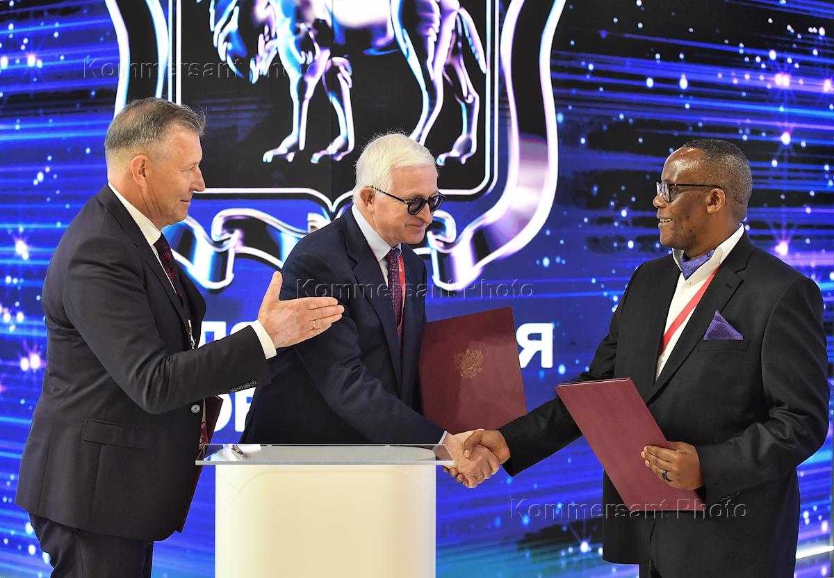 XXVIII Петербургский международный экономический форум (ПМЭФ) 2025 в конгрессно-выставочном центре "Экспофорум". Жанровая фотография. Участники во время церемонии подписания соглашения.
