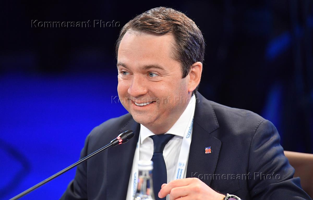 XXVIII Петербургский международный экономический форум (ПМЭФ) 2025 в конгрессно-выставочном центре "Экспофорум". Сессия "Новые маршруты международной торговли". Министр России по развитию Дальнего Востока и Арктики Алексей Чекунков во время сессии.