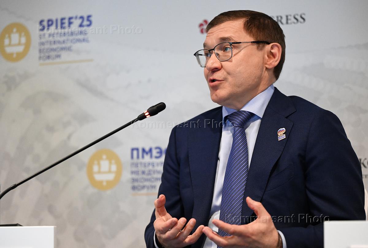 XXVIII St. Petersburg International Economic Forum (SPIEF) 2025 at the ExpoForum Convention and Exhibition Centre. Session: "Dual-use technologies and the future of global leadership". Acting Governor of Kursk Region Alexander Khinshtein (center) during the session.