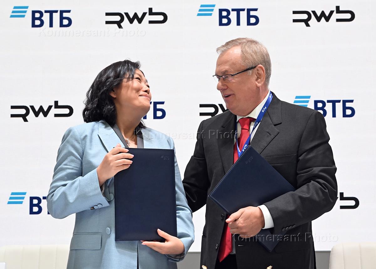 XXVIII Петербургский международный экономический форум (ПМЭФ) 2025 в конгрессно-выставочном центре "Экспофорум". Церемония подписания соглашения о строительстве креативно-производственного кластера в особой экономической зоне "Максимиха" между ООО РВБ (совместная компания маркетплейса Wildberries и группы Russ) и банка ВТБ. Основатель Wildberries, глава ООО РВБ Татьяна Ким (слева) и президент, председатель правления ПАО "Банк ВТБ" Андрей Костин (справа) во время церемонии.
