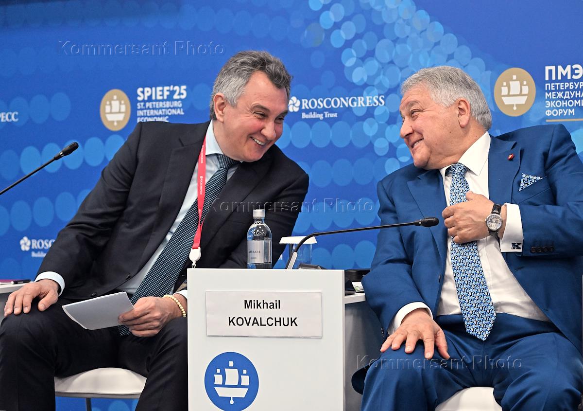 XXVIII Петербургский международный экономический форум (ПМЭФ) 2025 в конгрессно-выставочном центре "Экспофорум". Главный экономист Государственной корпорации развития "ВЭБ.РФ" Андрей Клепач (справа) на форуме.