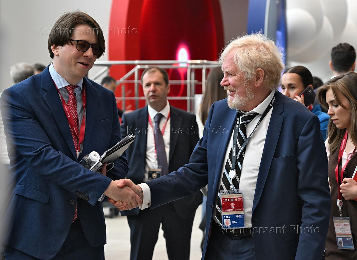 XXVIII Петербургский международный экономический форум (ПМЭФ) 2025 в конгрессно-выставочном центре "Экспофорум". Главный экономист Государственной корпорации развития "ВЭБ.РФ" Андрей Клепач (справа) на форуме.