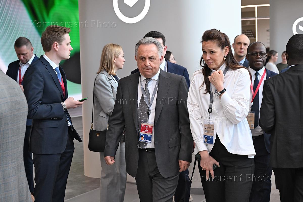 XXVIII Петербургский международный экономический форум (ПМЭФ) 2025 в конгрессно-выставочном центре "Экспофорум". Генеральный директор АО "ДОМ.РФ" Виталий Мутко (в центре) и директор пресс-службы АО "ДОМ.РФ" Оксана Волкова (справа) на форуме.