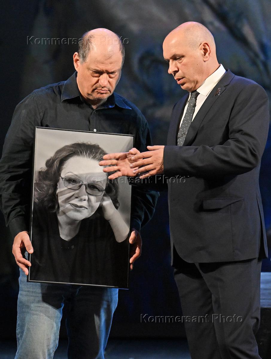 Farewell ceremony for People's Artist of Russia Natalia Tenyakova at the Chekhov Moscow Art Theatre. Rector of the Moscow Art Theatre School, actor Igor Zolotovitsky (center) and actor Evgeny Kindinov (right) speaking at the ceremony.