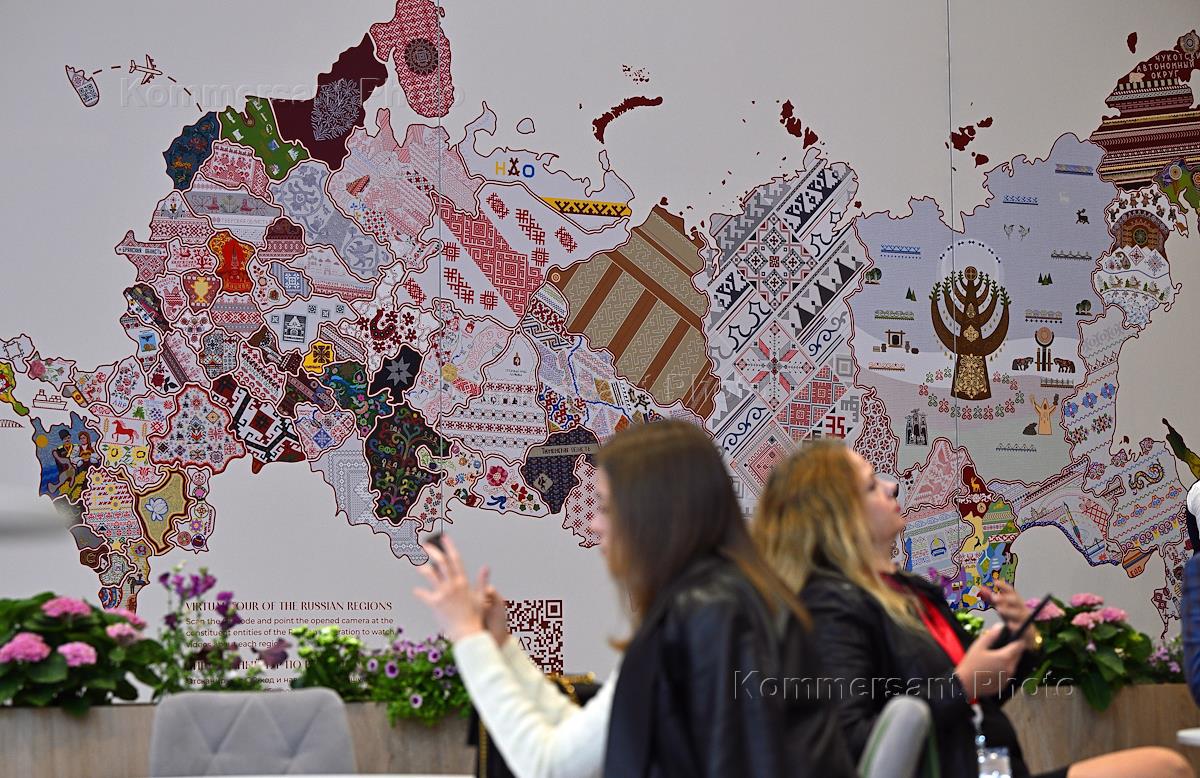 XXVIII St. Petersburg International Economic Forum (SPIEF) 2025 at the Expoforum Convention and Exhibition Center. Genre photography. Embroidered map of Russia.