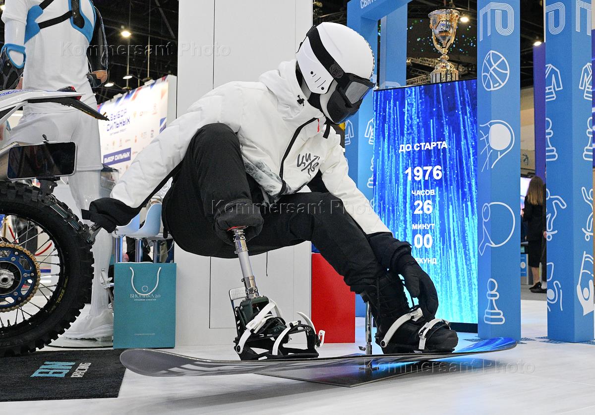 XXVIII St. Petersburg International Economic Forum (SPIEF) 2025 at the Expoforum Convention and Exhibition Center. Genre photography. A mannequin of a person with a prosthetic leg on a snowboard.