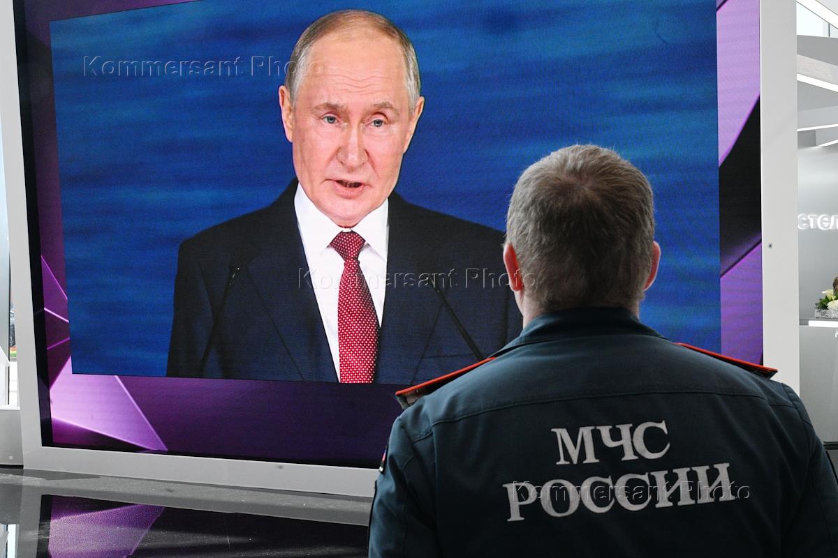XXVIII Петербургский международный экономический форум (ПМЭФ) 2025 в конгрессно-выставочном центре "Экспофорум". Жанровая фотография. Сотрудник МЧС России смотрит по телевизору выступление президента России Владимира Путина на пленарном заседании форума.