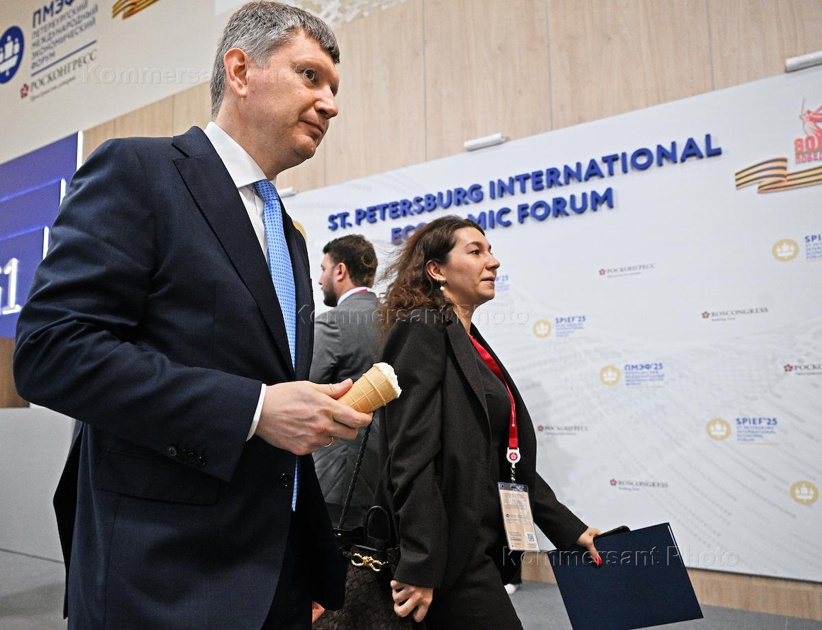 XXVIII Петербургский международный экономический форум (ПМЭФ) 2025 в конгрессно-выставочном центре "Экспофорум". Министр экономического развития России Максим Решетников (слева) на форуме.