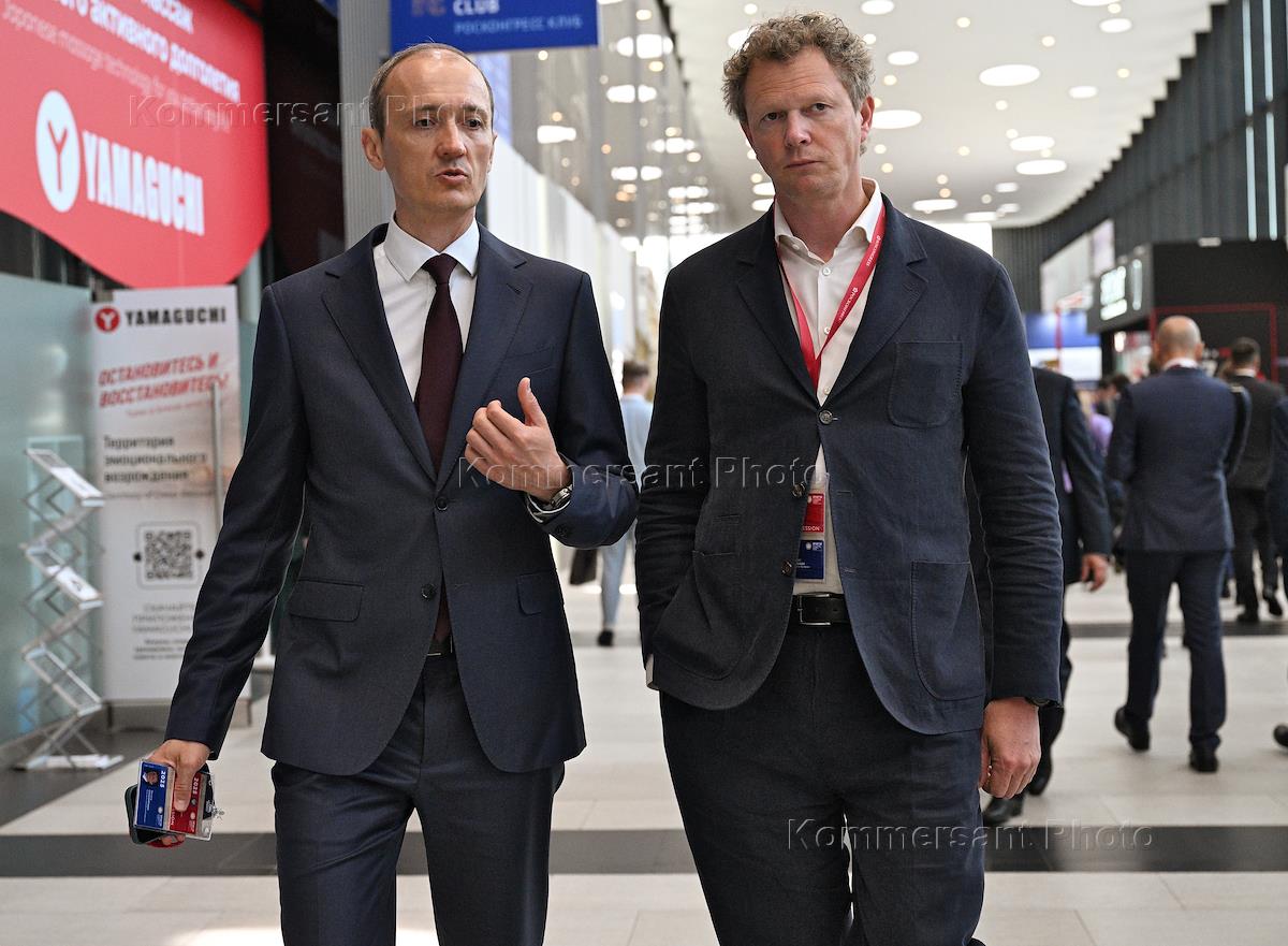 XXVIII Петербургский международный экономический форум (ПМЭФ) 2025 в конгрессно-выставочном центре "Экспофорум". Полномочный представитель Президента России в Уральском федеральном округе Артем Жога (справа) на форуме.