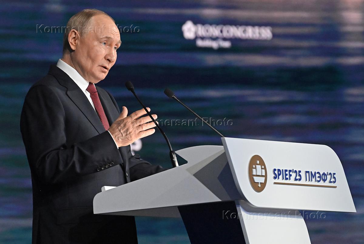XXVIII Петербургский международный экономический форум (ПМЭФ) 2025 в конгрессно-выставочном центре "Экспофорум". Пленарное заседание. Президент России Владимир Путин (слева) во время выступления на заседании.