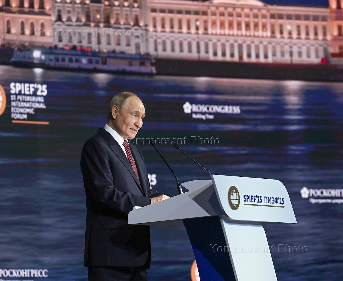 XXVIII Петербургский международный экономический форум (ПМЭФ) 2025 в конгрессно-выставочном центре "Экспофорум". Пленарное заседание. Президент России Владимир Путин (слева) во время выступления на заседании.