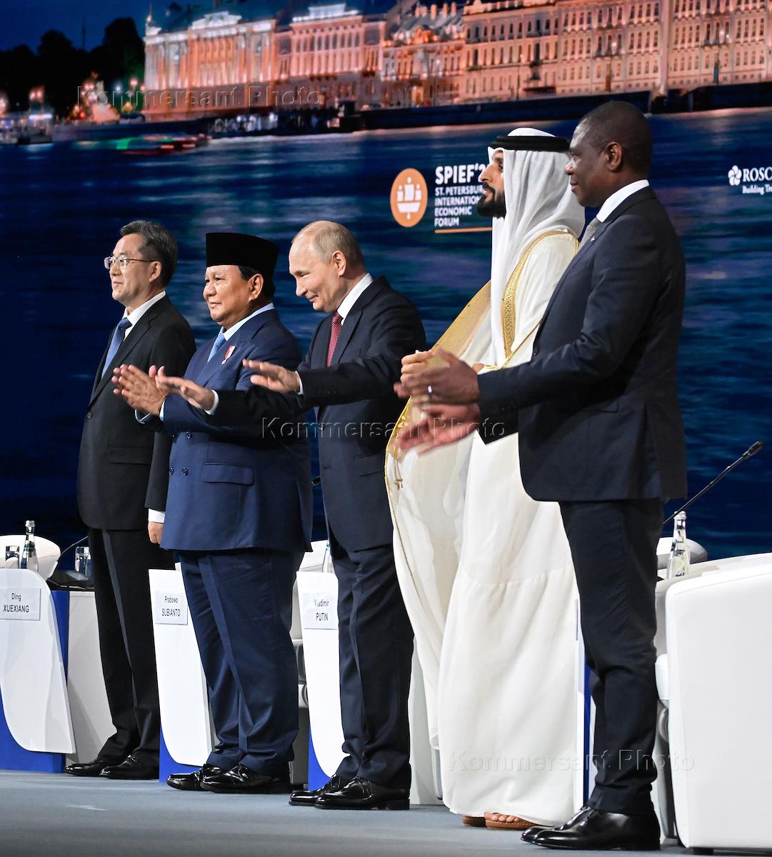 The XXVIII St. Petersburg International Economic Forum (SPIEF) 2025 at the ExpoForum Convention and Exhibition Centre. Plenary session. From left to right: Indonesian President Prabowo Subianto during the session.