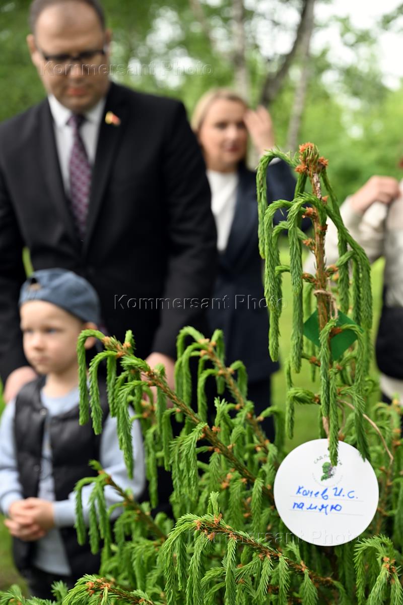 International event "Garden of Memory" near the Victory Museum on the territory of the memorial complex on Poklonnaya Hill. Memorial plaque of the daughter of Marshal Ivan Konev "Konev I.S. I remember" on a spruce branch.
