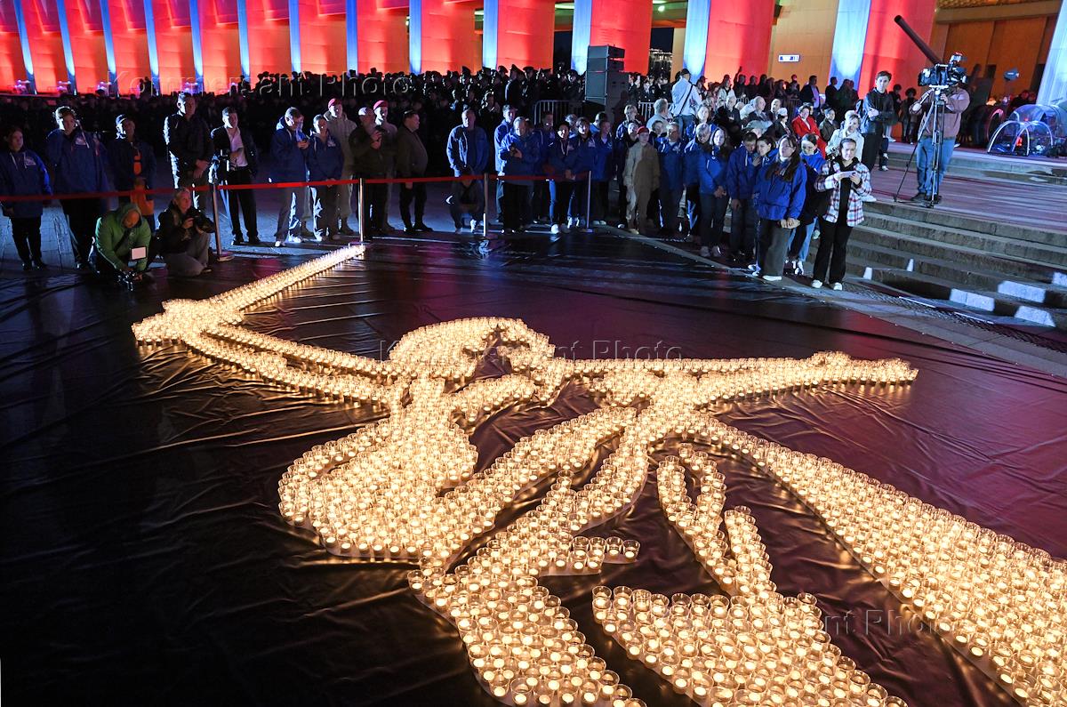 Акция "Огненные картины войны", посвященная Дню памяти и скорби, на площади у Музея Победы на Поклонной горе. Активисты партии "Единая Россия" и движения "Волонтеры Победы" выкладывают светящийся силуэт скульптуры "Родина-мать зовет".