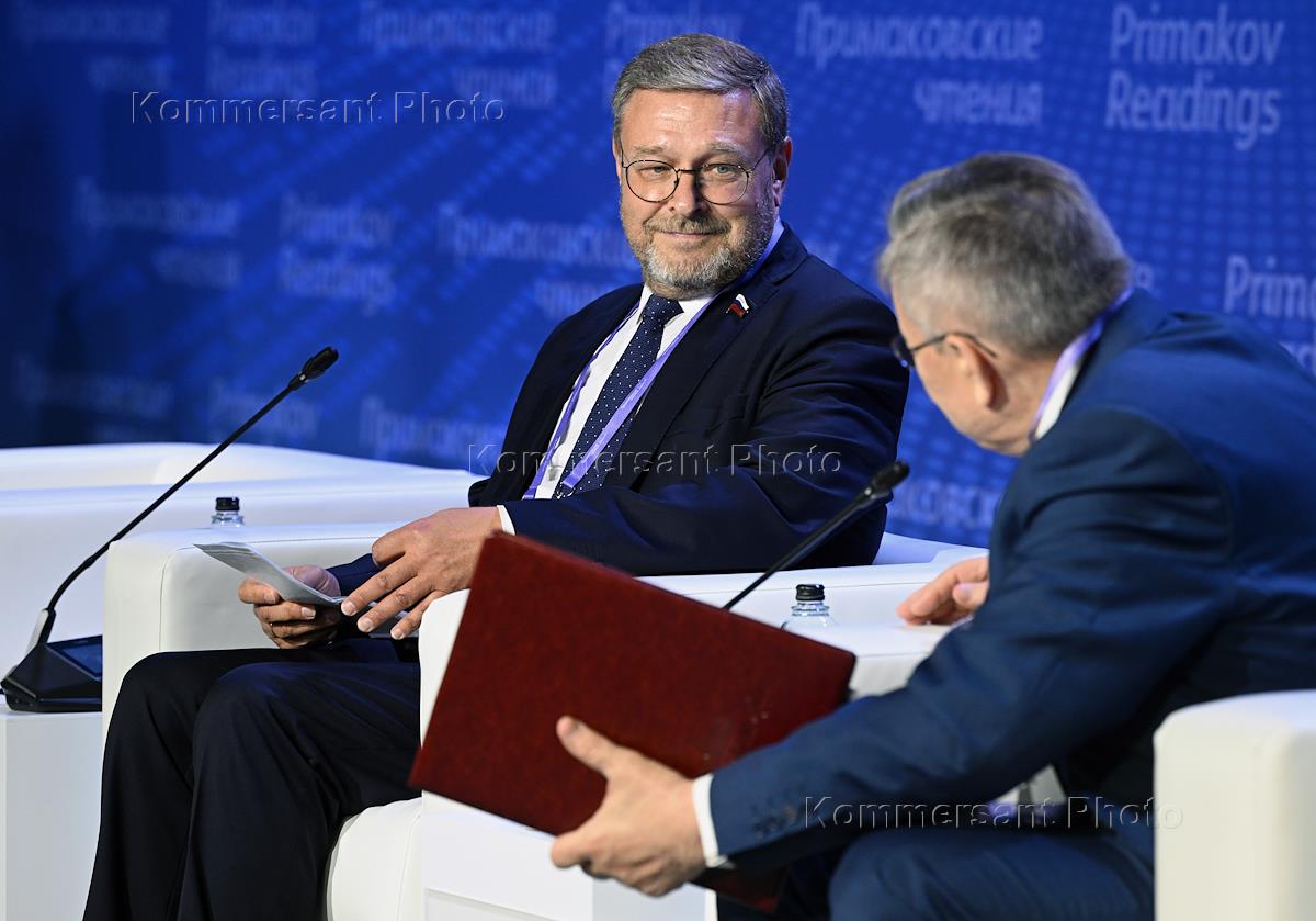 XI международный научно-экспертный форум "Примаковские чтения" в Radisson Blu Leninsky Prospect Hotel. Заместитель председателя Совета Федерации России Константин Косачев (слева) и академик РАН, директор Института проблем лазерных и информационных технологий РАН Владислав Панченко во время заседания форума.