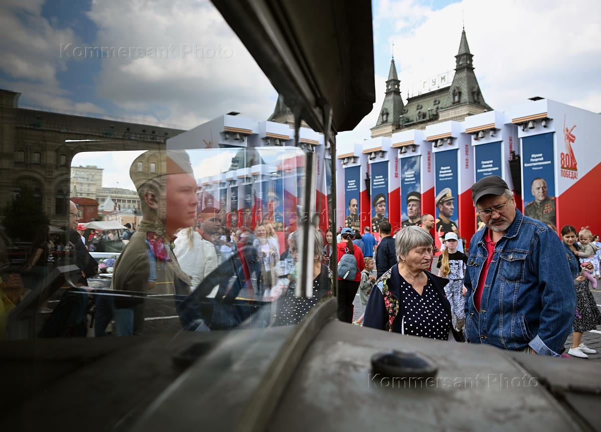 Иммерсивный музей под открытым небом, посвященный 80-летию Парада Победы, на Красной площади. Посетители в музее.