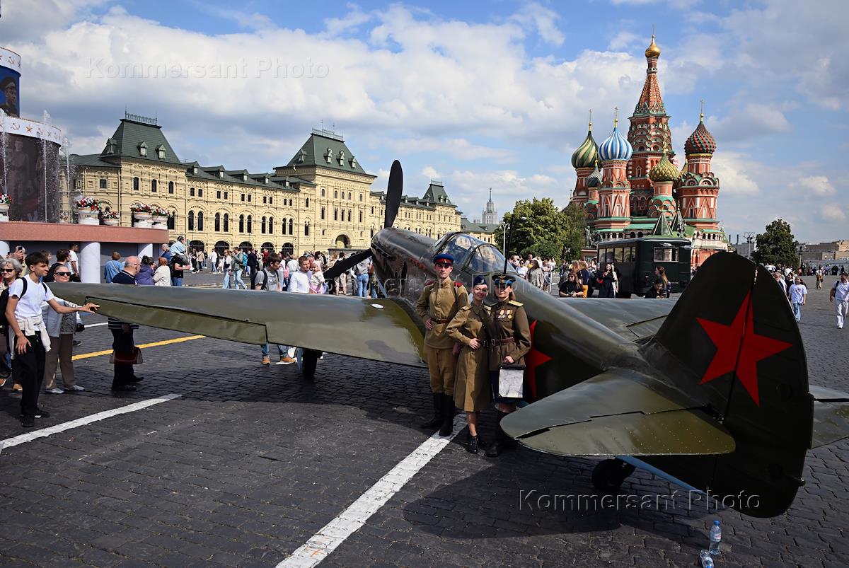 Иммерсивный музей под открытым небом, посвященный 80-летию Парада Победы, на Красной площади. Самолет времен Великой Отечественной войны в музее.