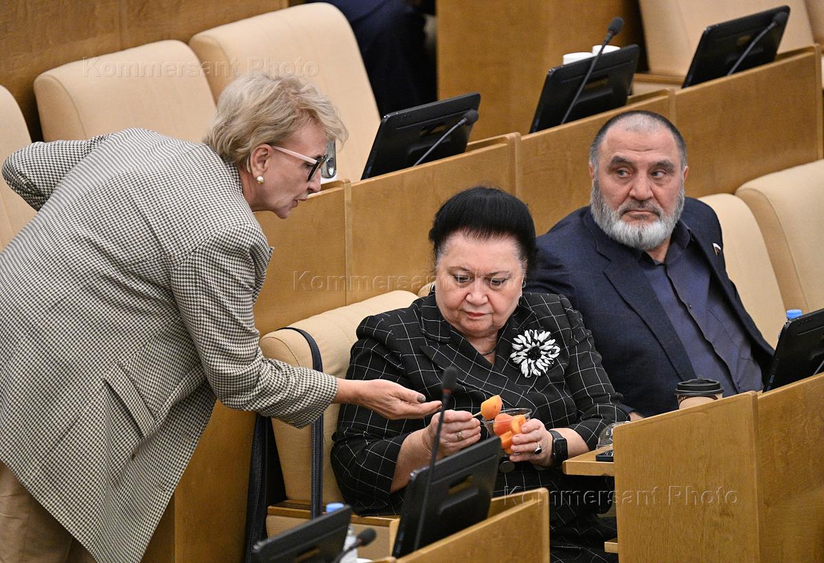 Пленарное заседание Государственной думы (ГД) России. Справа налево: заместитель председателя комитета ГД России по федеративному устройству и вопросам местного самоуправления Валентина Терешкова, заместитель руководителя фракции "Единая Россия" в ГД России Ольга Тимофеева и председатель комитета ГД России по обороне Андрей Картаполов во время заседания.
