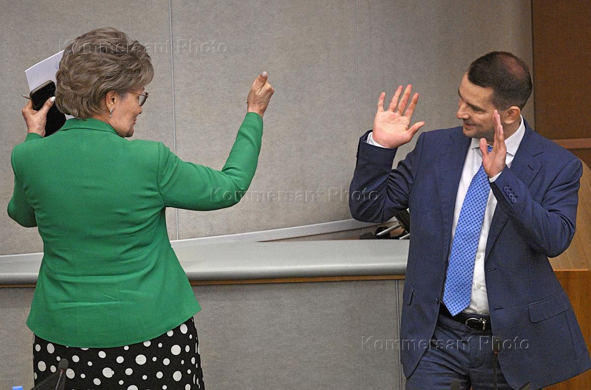 Пленарное заседание Государственной думы (ГД) России. Председатель комитета Государственной думы России по труду, социальной политике и делам ветеранов Ярослав Нилов (справа) и член комитета ГД России по защите семьи, вопросам отцовства, материнства и детства Татьяна Ларионова (слева) во время заседания.