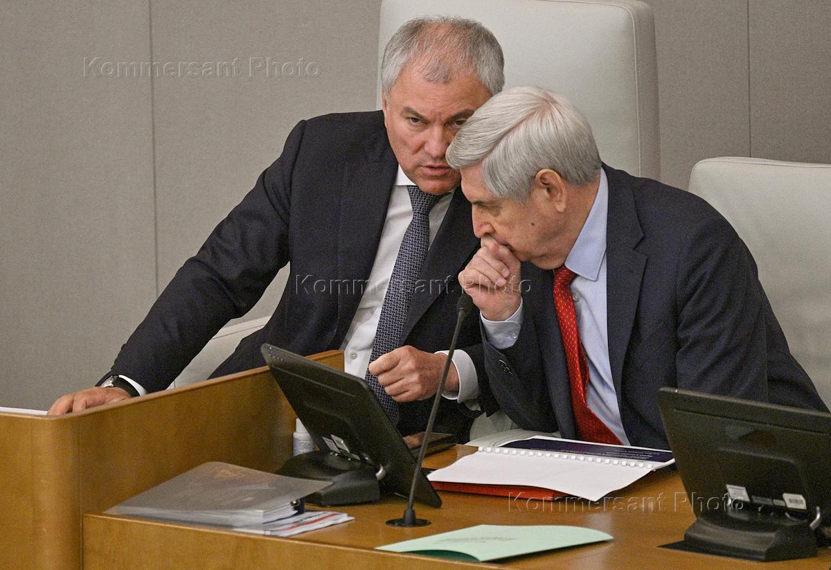 Пленарное заседание Государственной думы (ГД) России. Председатель ГД России Вячеслав Володин (справа) и заместитель председателя ГД России Анна Кузнецова (слева) во время заседания.
