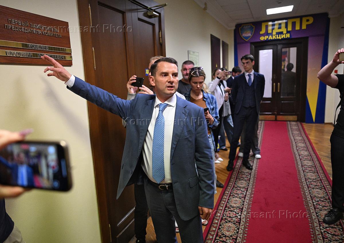 Пленарное заседание Государственной думы (ГД) России. Председатель комитета ГД России по труду, социальной политике и делам ветеранов Ярослав Нилов (справа) после окончания заседания.