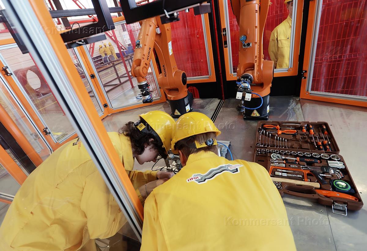 Временно исполняющий обязанности губернатора Свердловской области Денис Паслер (слева) во время посещения образовательного центра программы "Будущее Белой металлургии".