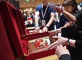 ХХХI Торжественная церемония вручения Российской национальной театральной премии "Золотая Маска" за лучшие спектакли сезона 2023-2024 в Татарском государственном академическом театре имени Галиасгара Камала. Жанровая фотография. Приз "золотая Маска" в бархатном футляре.
