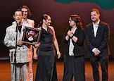 ХХХI Торжественная церемония вручения Российской национальной театральной премии "Золотая Маска" за лучшие спектакли сезона 2023-2024 в Татарском государственном академическом театре имени Галиасгара Камала. Актеры Константин Шавкунов (слева) и Евгения Бурмака (в центре) во время церемонии.
