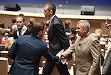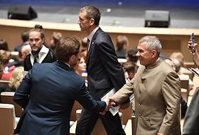 ХХХI Торжественная церемония вручения Российской национальной театральной премии "Золотая Маска" за лучшие спектакли сезона 2023-2024 в Татарском государственном академическом театре имени Галиасгара Камала. Глава Республики Татарстан Рустам Минниханов (слева) и председатель СТД России, художественный руководитель Московского театра Олега Табакова, директор театра "Современник", актер, режиссер Владимир Машков (справа) на церемонии.