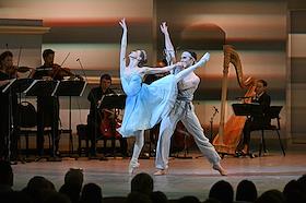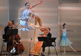 Творческий вечер "20/15 вместе" солистов балета Государственного академического Большого театра (ГАБТ) России Анастасии Сташкевич и Вячеслава Лопатина в Концертном зале имени П.И.Чайковского Московской филармонии. Солисты балета ГАБТ России Анастасия Сташкевич, Вячеслав Лопатин и арфистка Марина Чудакова во время выступления.