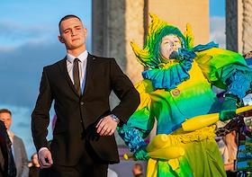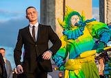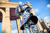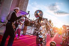 Празднование городского выпускного для московских школьников на территории ВДНХ. Жанровая фотография. Аниматоры в зеркальных костюмах во время встречи выпускников на красной дорожке.