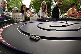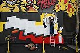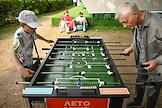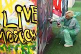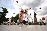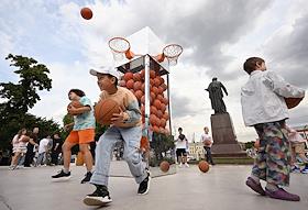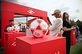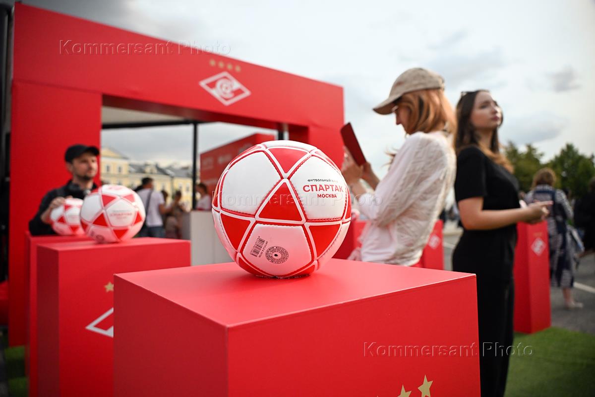 Празднование Дня молодежи на Болотной площади. Жанровая фотография. Стойка футбольного клуба (ФК) "Спартак" и футбольный мяч ФК "Спартак" на пьедестале в спортивном хабе.